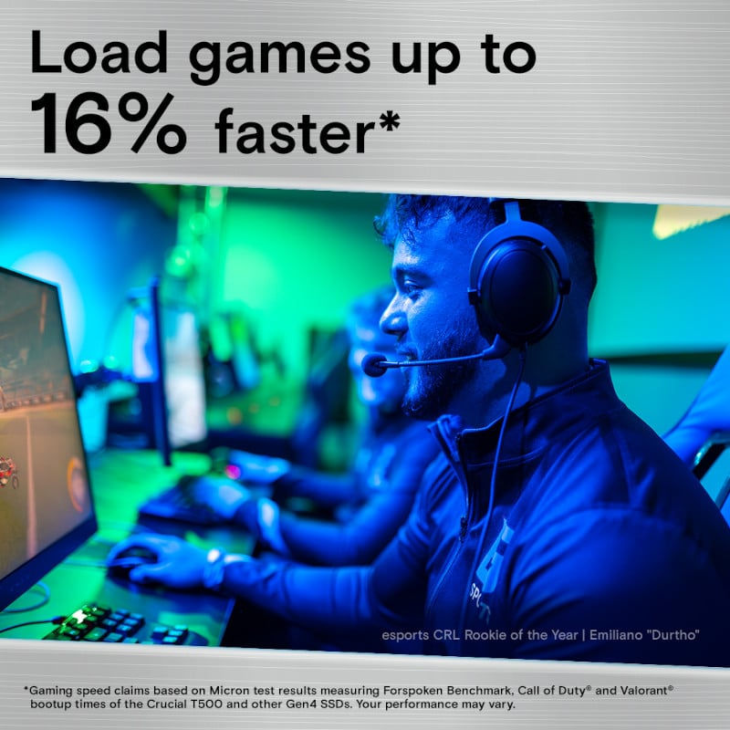 The Crucial T500 PCIe� Gen4 NVMe SSD will improve your gaming and content creation experience. The T500 is a game changer, designed for high-performance gaming, PS5 upgrades, and photo/video editing. With sequential read/write speeds of up to 7,000/6,900MB/s and random read/write speeds of up to 1.35M IOPs, you�ll be able to load games 16% faster and enjoy a 42% increase in content creation app performance.